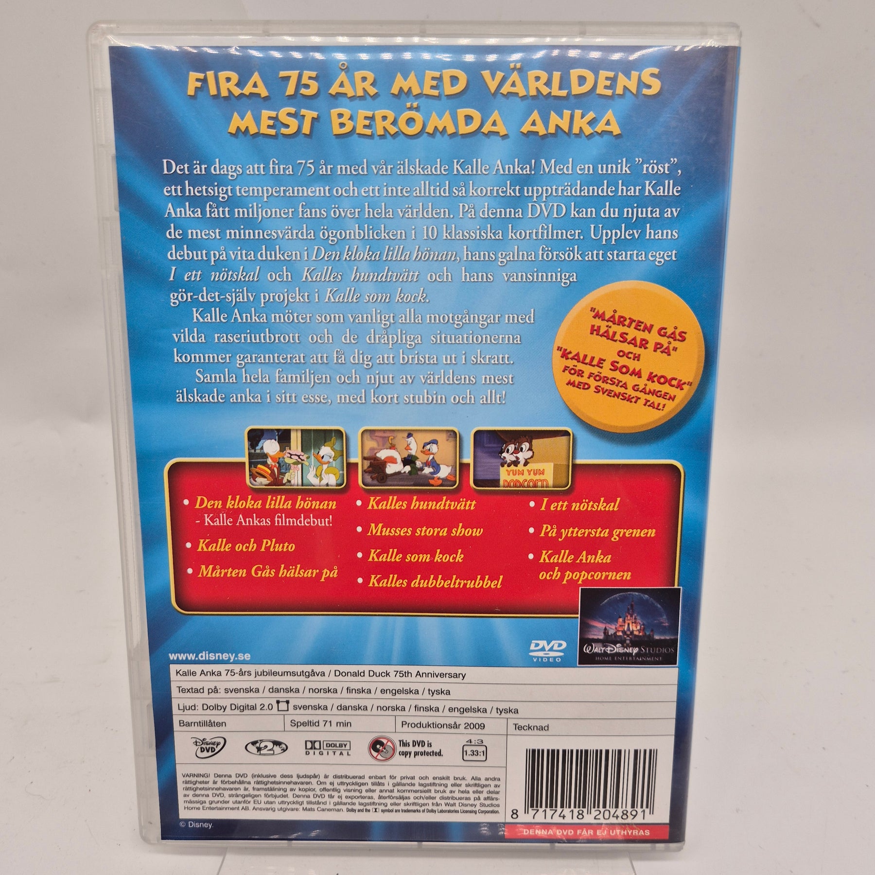 Denna DVD firar 75 år med en av Disneys mest älskade karaktärer, Kalle Anka. Utgåvan inkluderar tio klassiska kortfilmer som visar Kalles unika humor och äventyr. DVD:n är perfekt för Disneyentusiaster och samlare, och är en utmärkt gåva för alla åldrar. Skivan är i mycket gott begagnat skick och ger garanterad familjeunderhållning.
