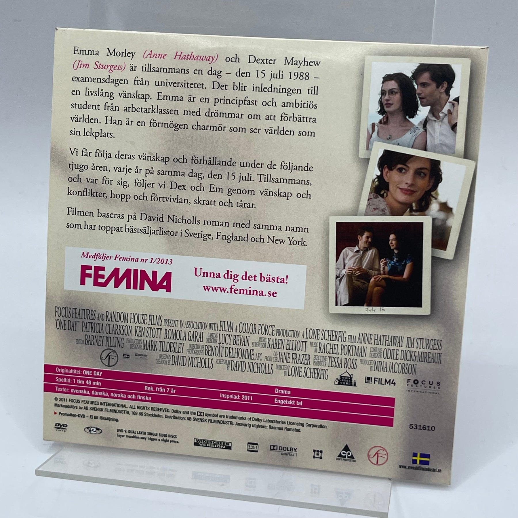 "En Dag" är en film på DVD baserad på David Nicholls populära roman. Denna dramafilm med Anne Hathaway och Jim Sturgess skildrar en komplex men hänförande berättelse om vänskap och kärlek över åren. Perfekt för en filmkväll med djup och substans. DVD:n är begagnad men i mycket gott skick och kommer komplett med originalfodral.Produktspecifikationer
