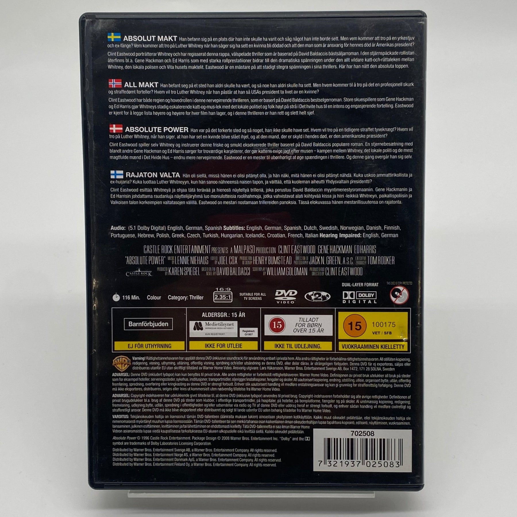 Denna DVD, "Absolute Power" från Clint Eastwood Collection, är en spännande thriller där Eastwood spelar en skicklig tjuv som bevittnar ett mord. Filmens fascinerande plot och starka skådespelarinsatser gör den till en fängslande upplevelse. Skivan är använd men i gott skick.