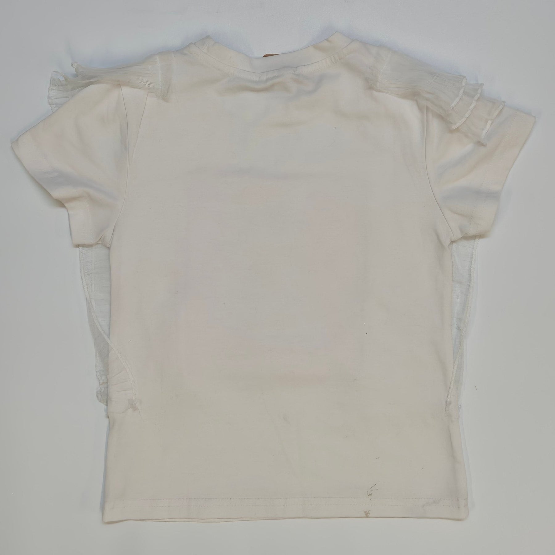 Elegant vit T-shirt för barn med dekorativt paljettmotiv och ruffles på axlarna. Användbar för vardag eller fest. Skicket är begagnat men i bra skick.