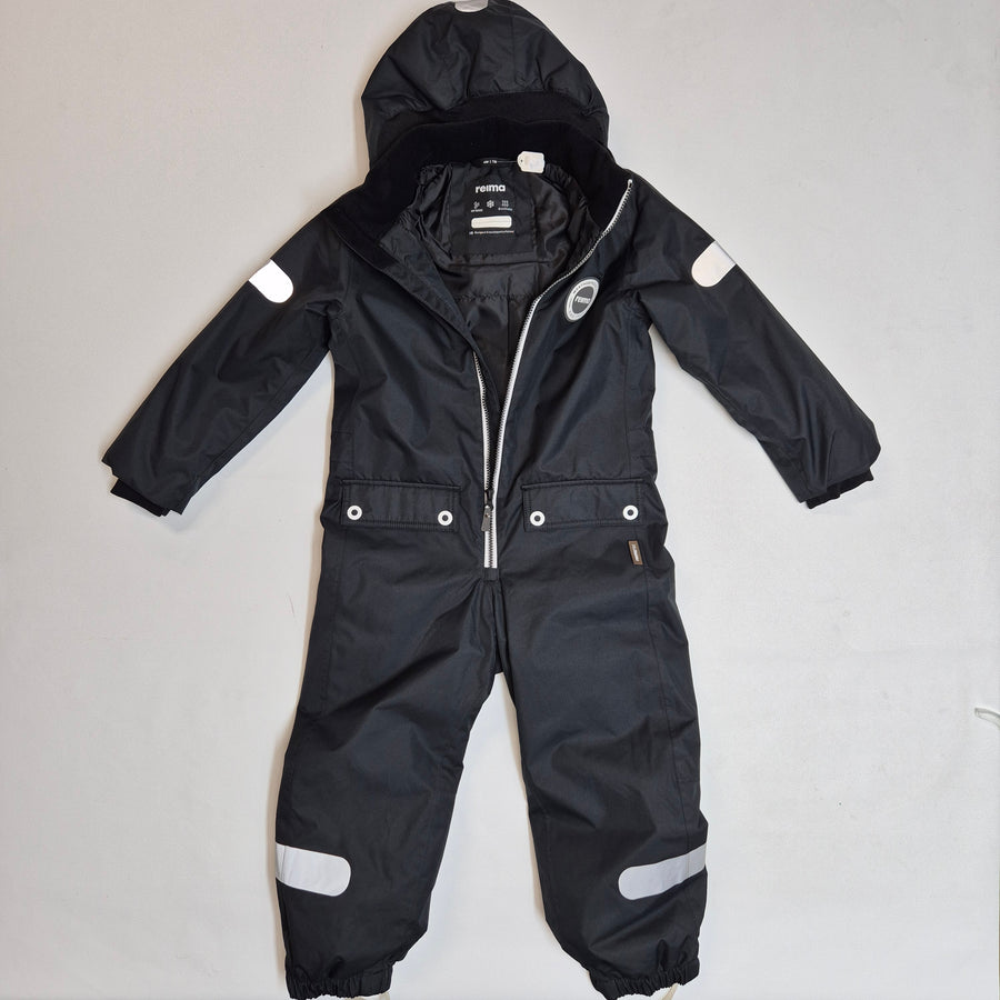 Använda barnregnställ med hängslen. Perfekt för att hålla ditt barn torrt under regniga dagar. Regnstället har reflekterande ränder för ökad säkerhet. I gott skick, lämpligt för utomhuslek.