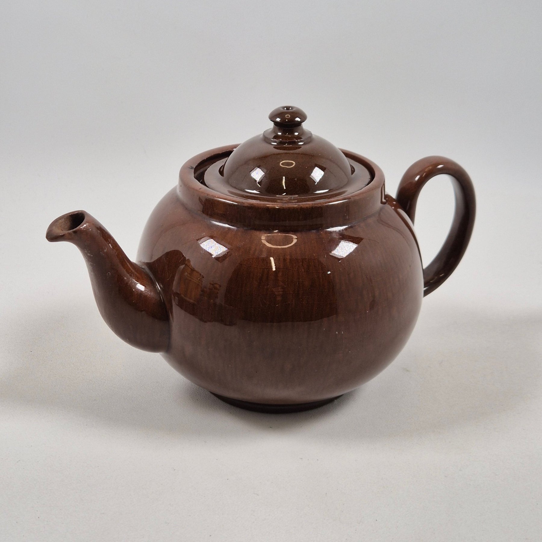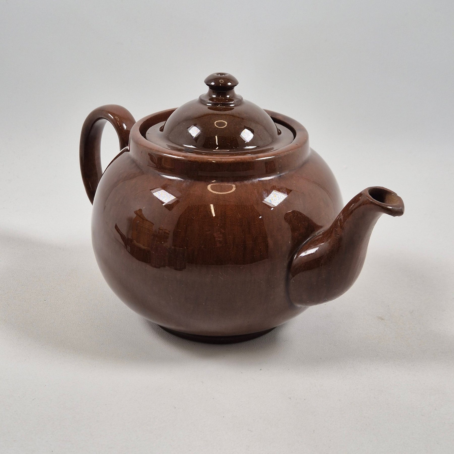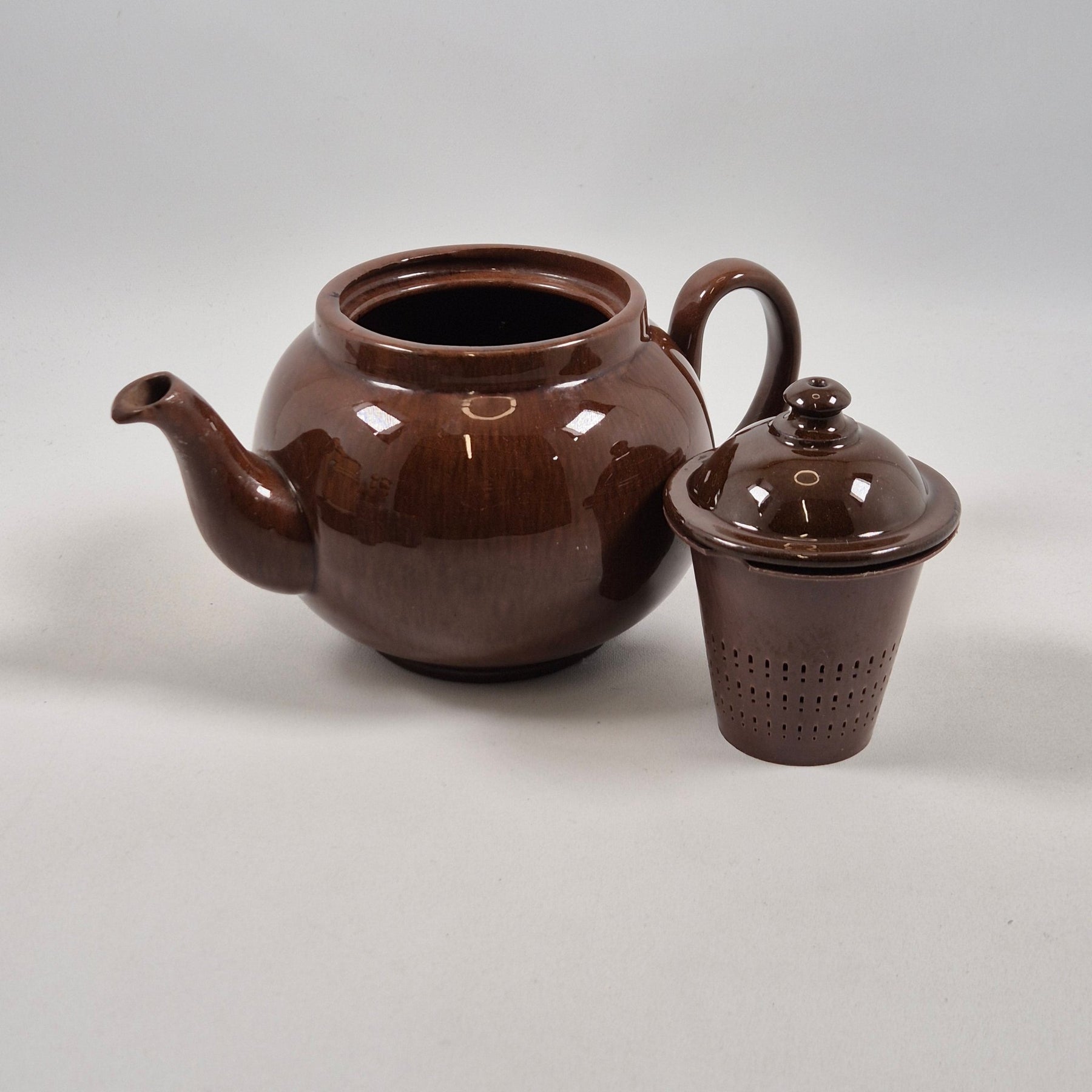 Elegant och funktionell brun keramisk tekanna med tillhörande tekopp med sil. Perfekt för tedrickare som vill njuta av sin brygd på ett traditionellt sätt. Använd men i gott skick.