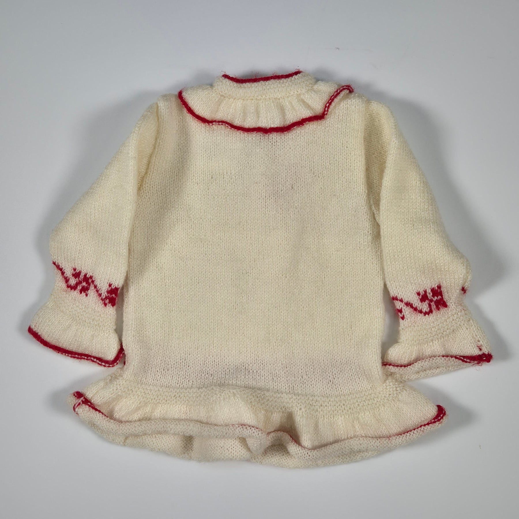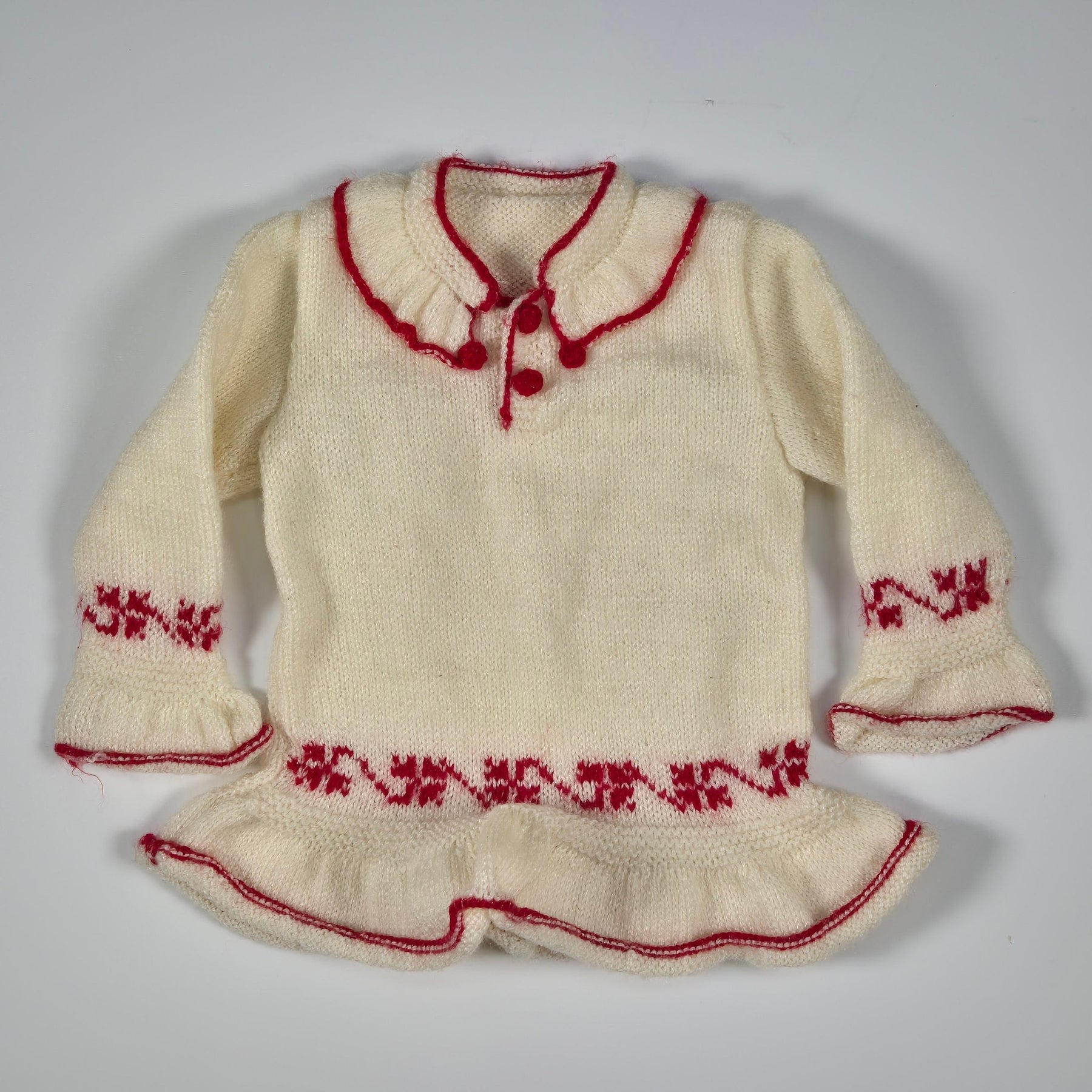 - Denna charmiga stickade barntröja har dekorativa röda detaljer och en söt krage.