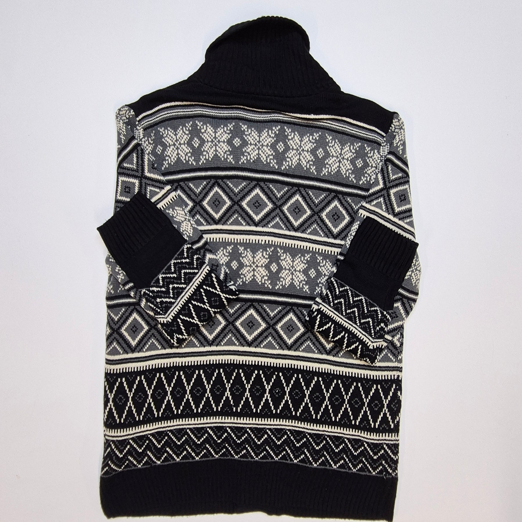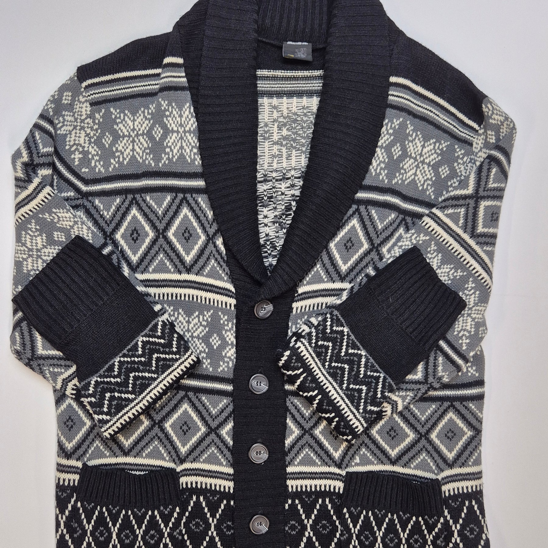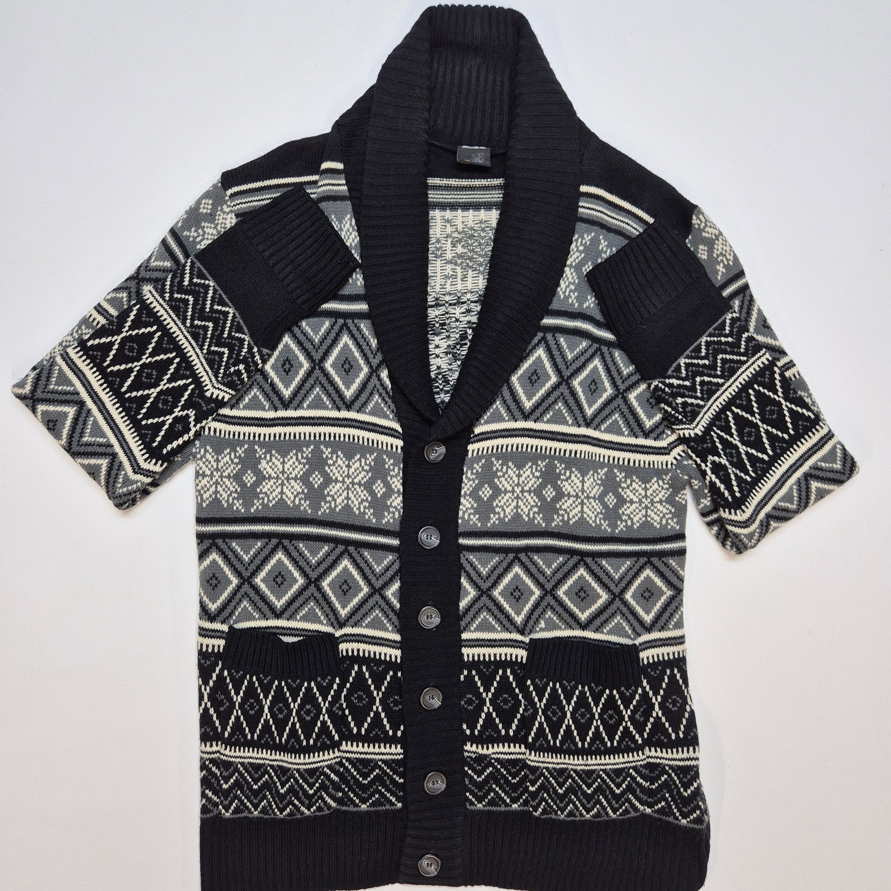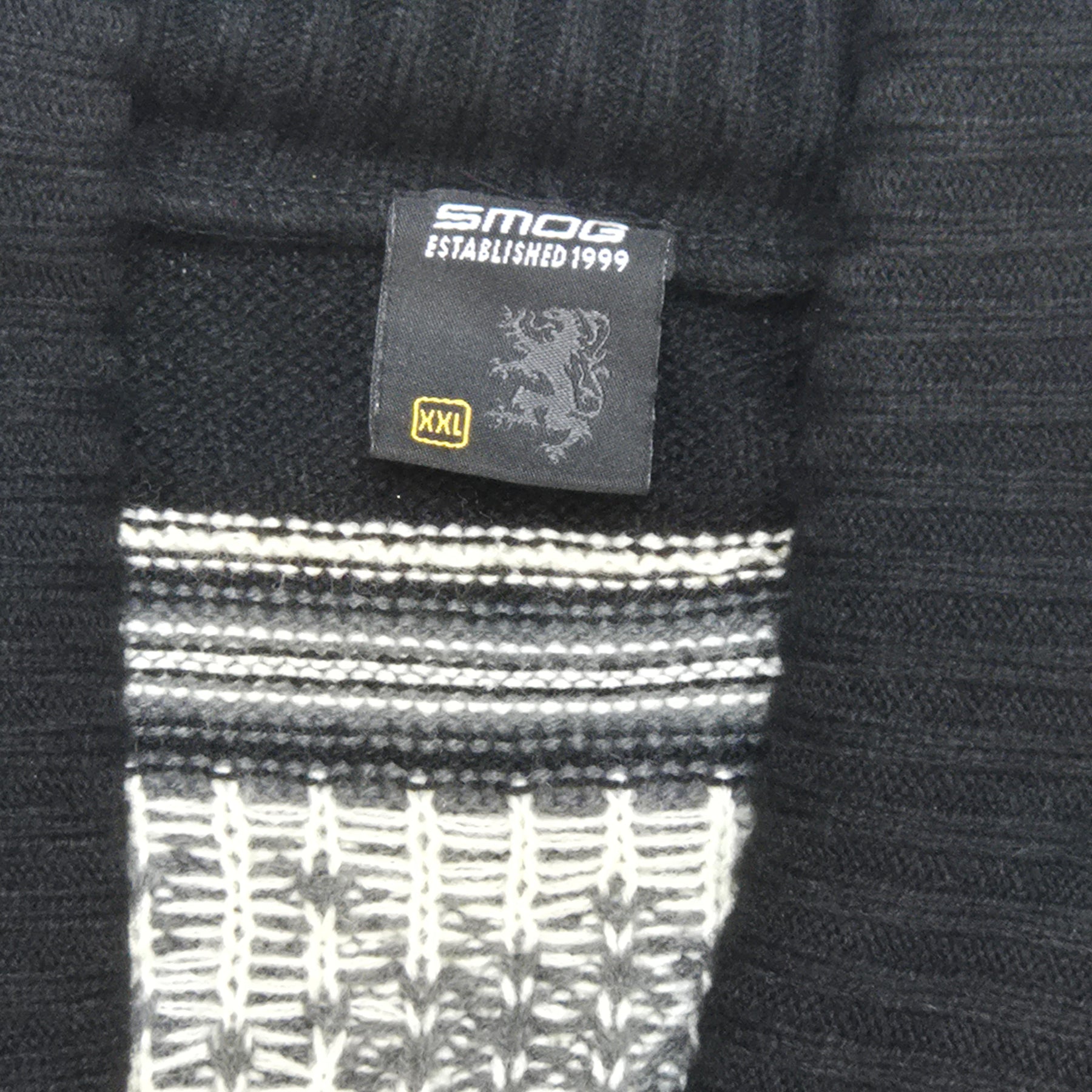 Denna charmiga stickade kofta från märket Smog, etablerat 1999, utstrålar en klassisk känsla med sitt detaljerade mönster och mjuka material. Koftan är utformad för att ge värme och komfort under kyligare dagar, samtidigt som den förblir stilfull med sin välstrukturerade design. Den är begagnad men fortfarande i mycket gott skick, en utmärkt komponent för den modeintresserade som värdesätter tidlöshet och kvalitet i sina klädesval.Produktspecifikationer