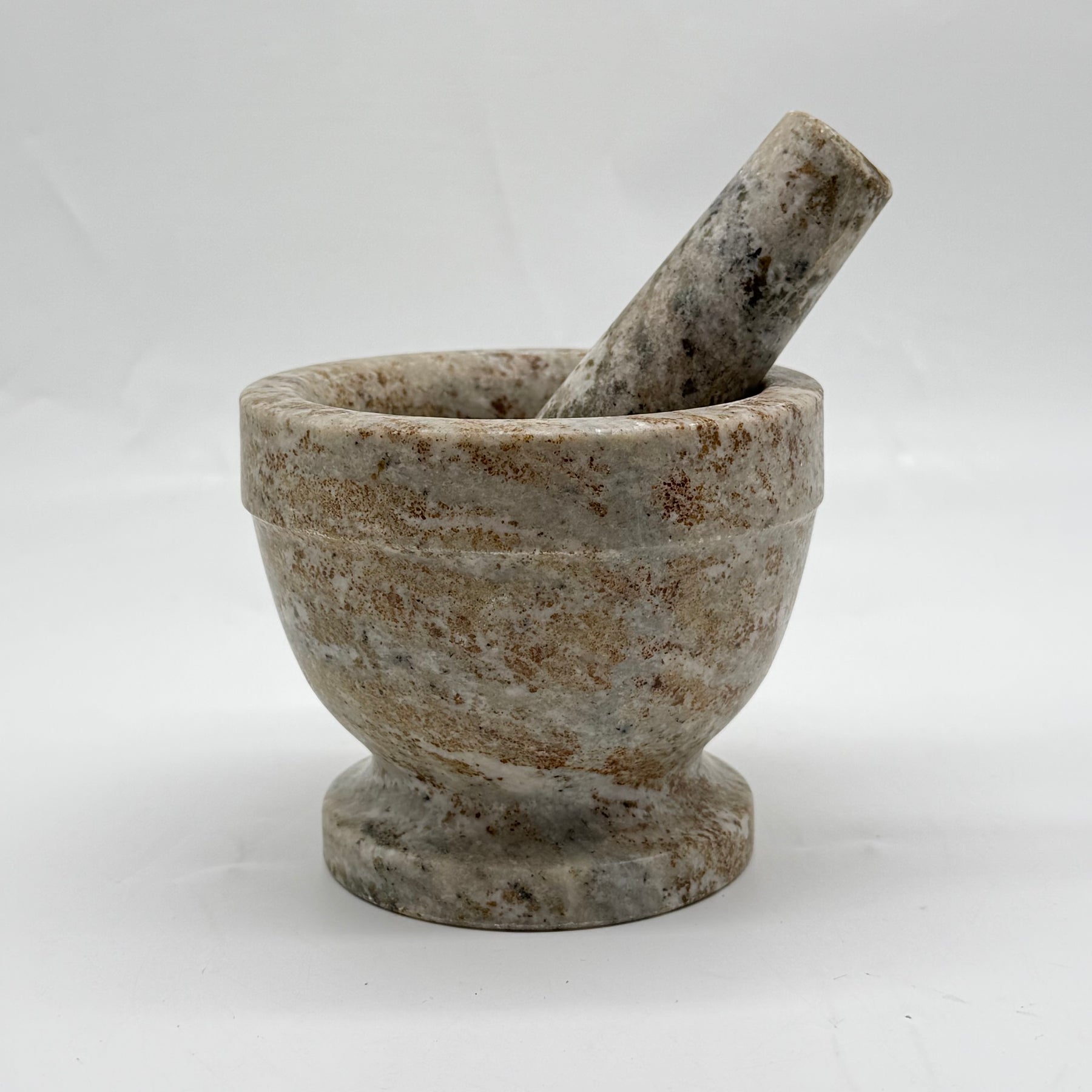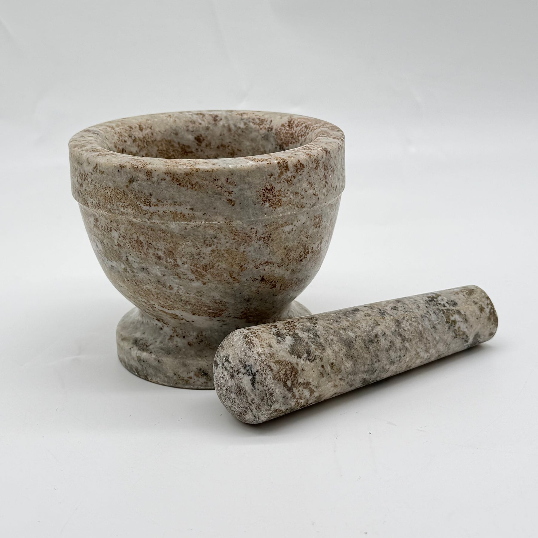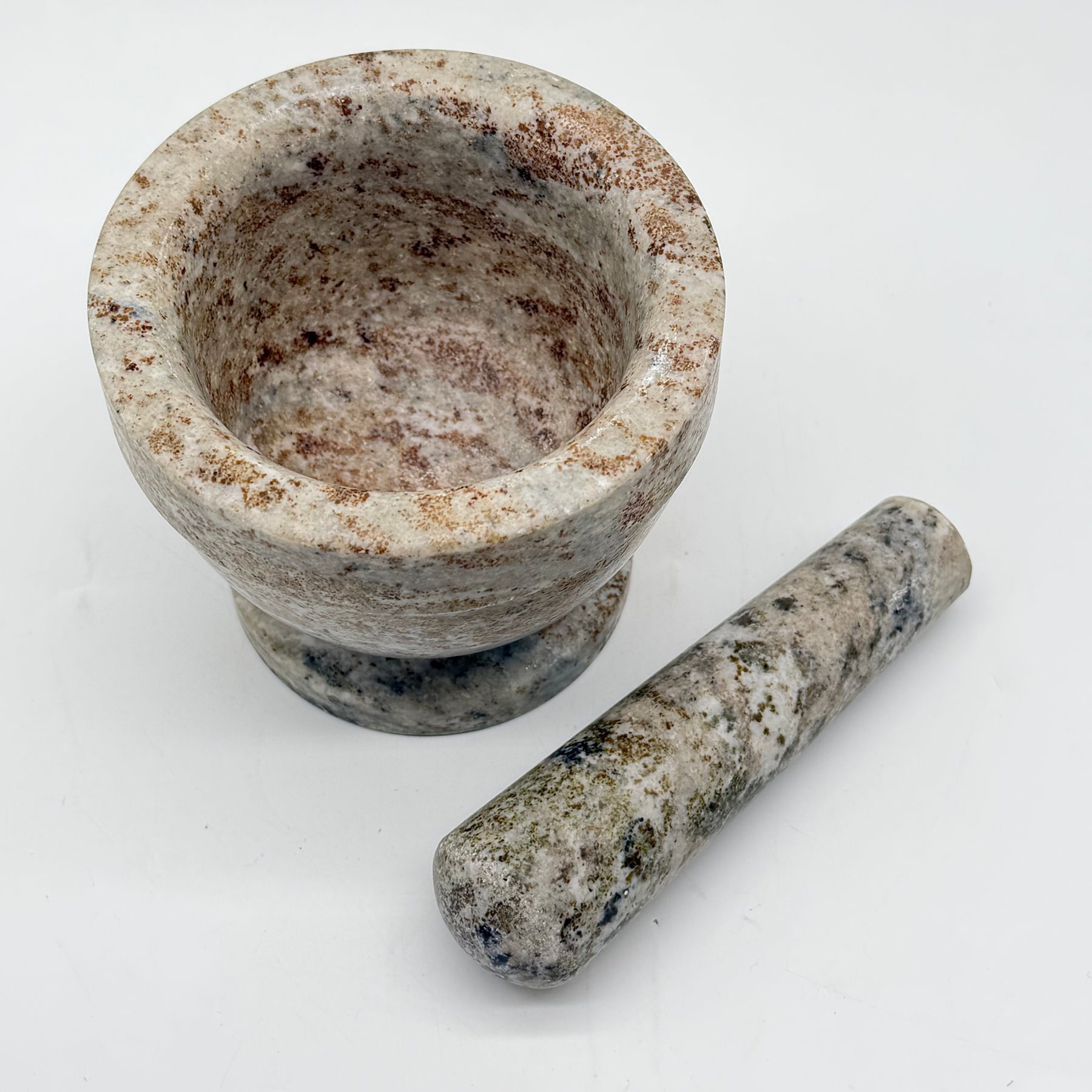 Upptäck charmen med denna rustika marmormortel, en perfekt blandning av funktionalitet och estetik.