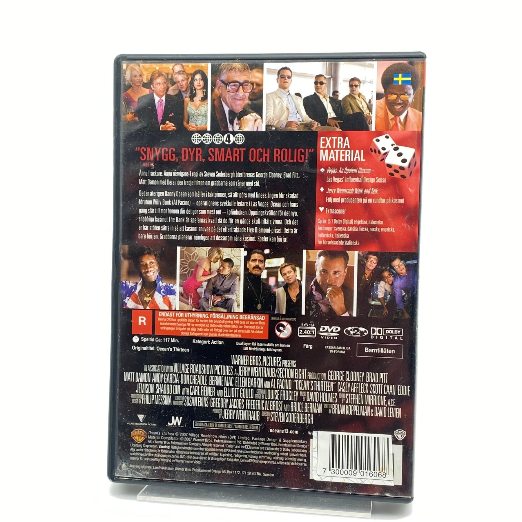 Denna DVD innehåller filmen 'Ocean's Thirteen', den populära heist-filmen med en stjärnspäckad ensemble, inklusive George Clooney och Brad Pitt. Filmen är känd för sin spännande handling och smarta dialoger, optimal för en filmkväll. DVD:n kommer med extra material som ger en djupare inblick i filmens tillkomst. Skick: Begagnad men i mycket gott skick.
