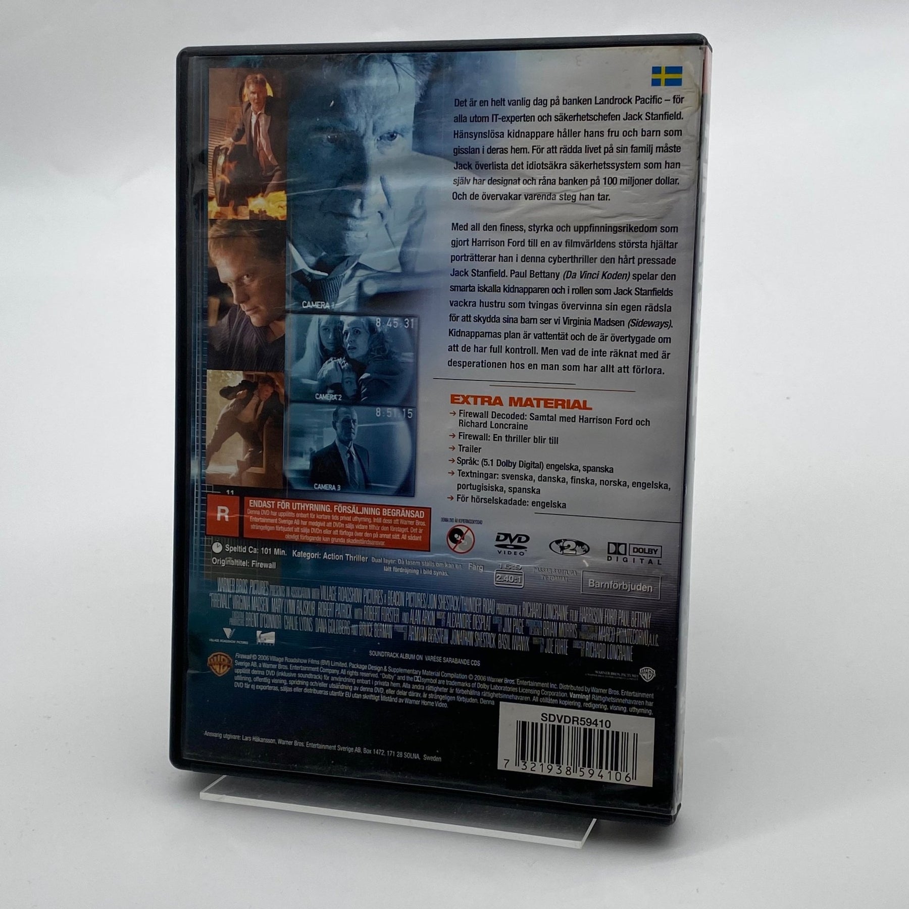 Upplev nervkittlande spänning med "Firewall", en film där Harrison Ford brillierar som säkerhetsexpert. Denna DVD erbjuder inte bara en fängslande historia, utan också extra material som intervjuer och bakom kulisserna-inslag. Begagnad men välbevarad, den är ett måste för alla filmälskare.3. Produktspecifikationer