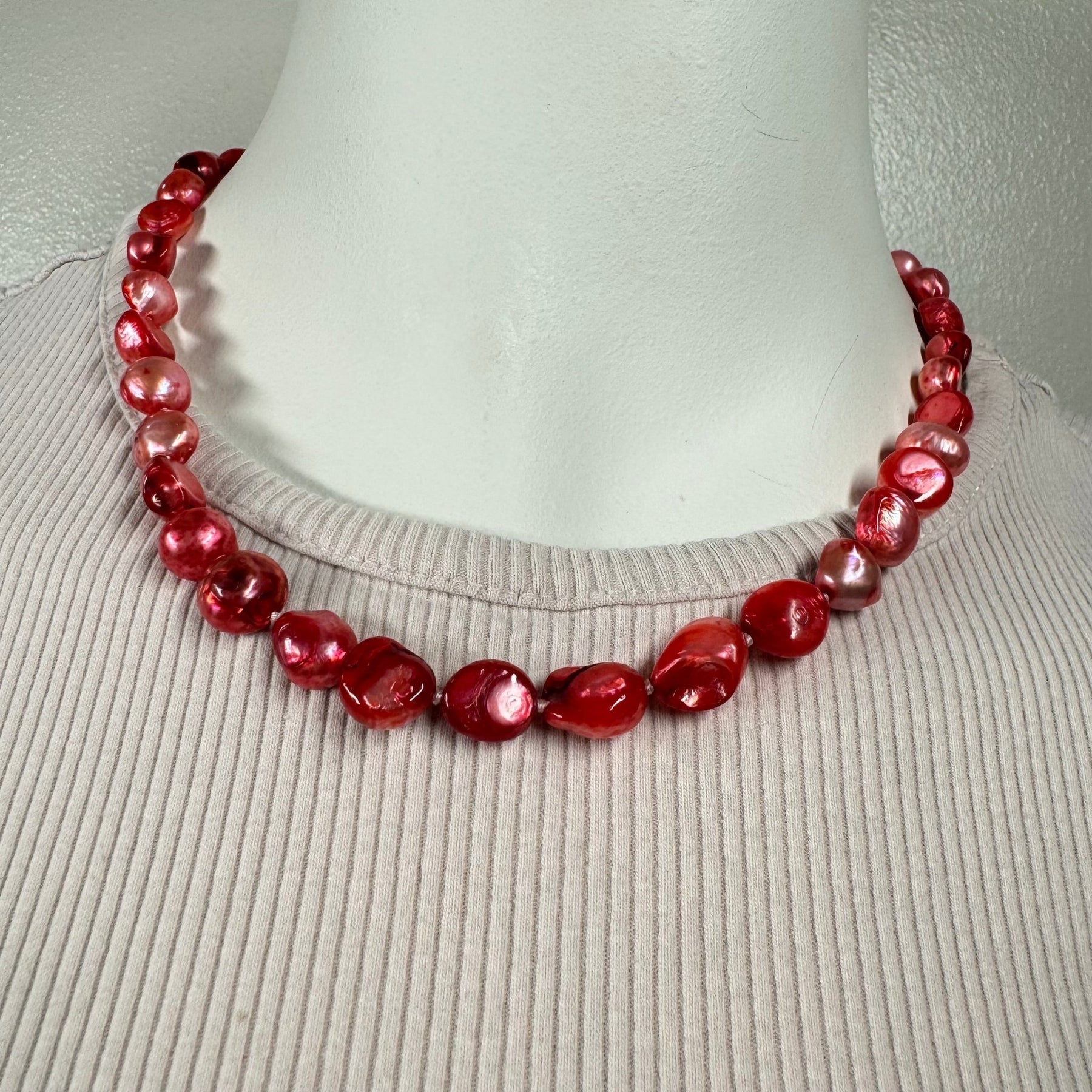 Detta vackra röda pärlemorhalsband ger en livlig och elegant touch till din outfit. Pärlorna är tillverkade av högkvalitativ pärlemor som skiftar i olika nyanser av rött, vilket skapar ett unikt och strålande utseende. Halsbandet är perfekt för både vardag och fest, och dess intensiva färg gör det till en iögonfallande accessoar.