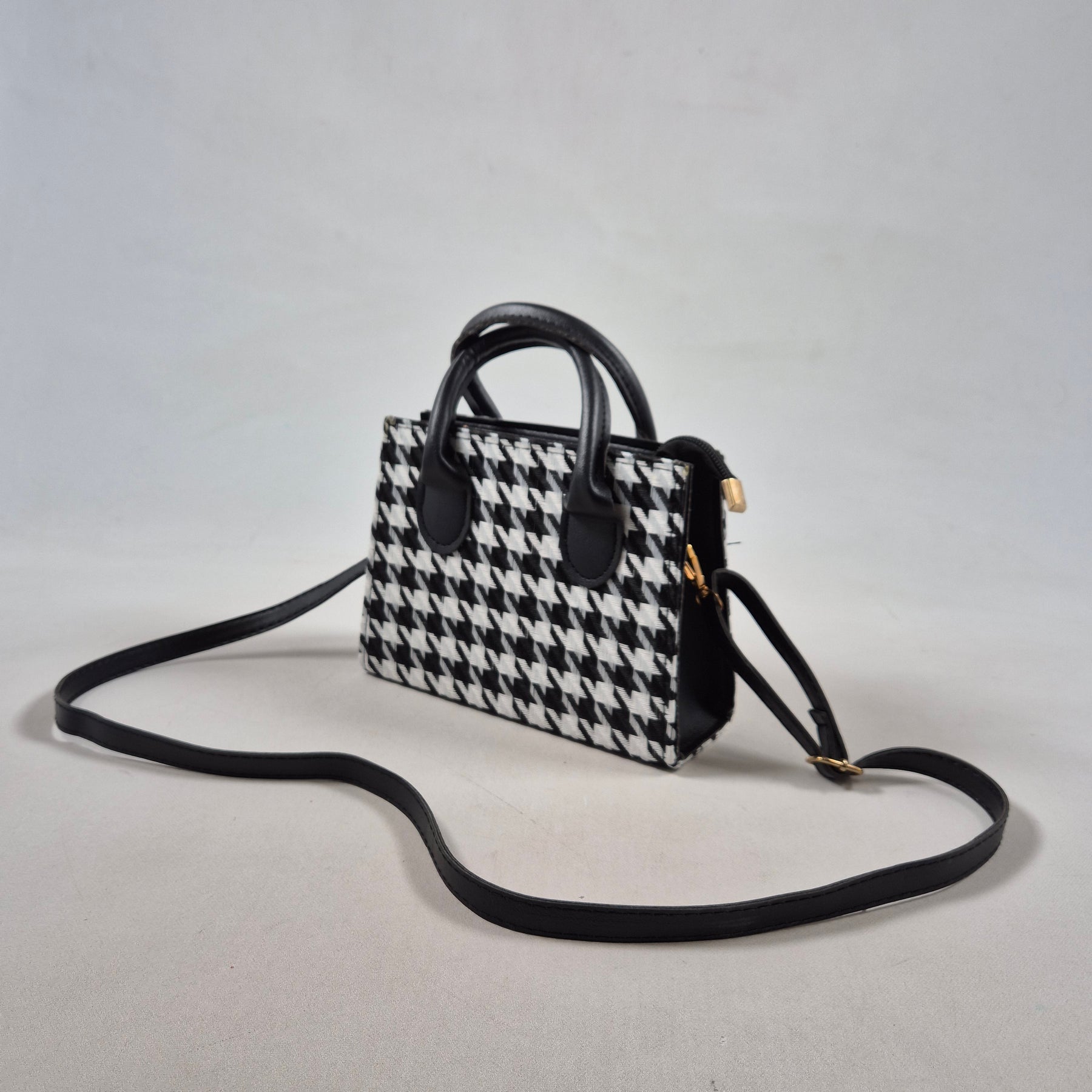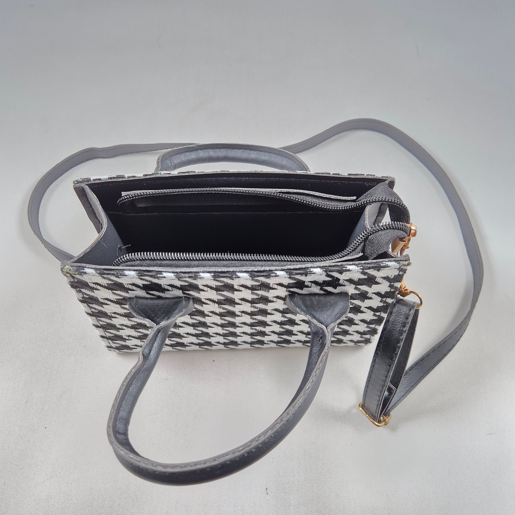 Denna handväskas klassiska houndstooth-design och eleganta svarta läderdetaljer kombinerar både funktionalitet och stil. Väskan har en praktisk axelrem och är utrustad med flera fack för organiserad förvaring. Dess kompakta storlek gör den idealisk för både dagligt bruk och speciella tillfällen. Väskan är lätt begagnad men fortfarande i utmärkt skick, vilket gör den till ett smart och hållbart val för modeintresserade.
